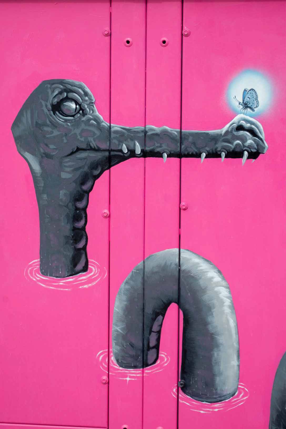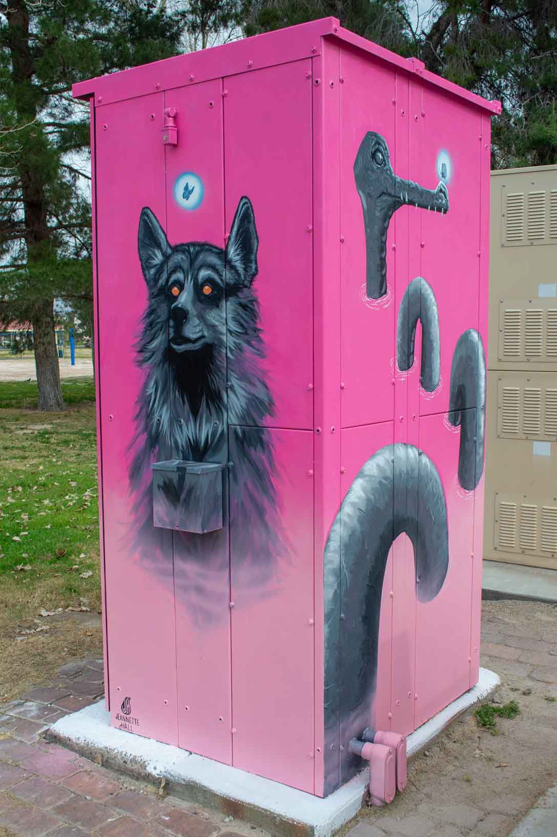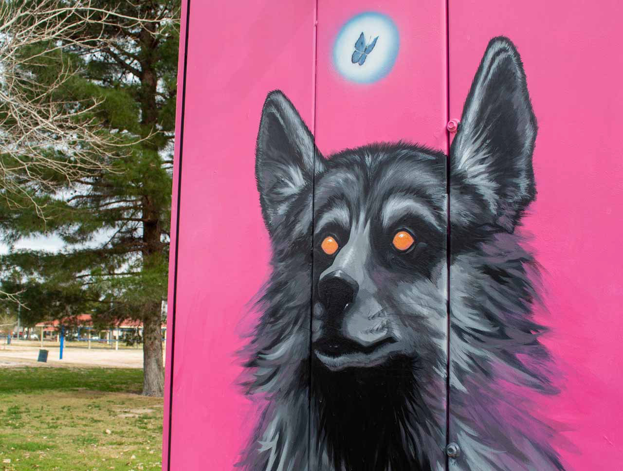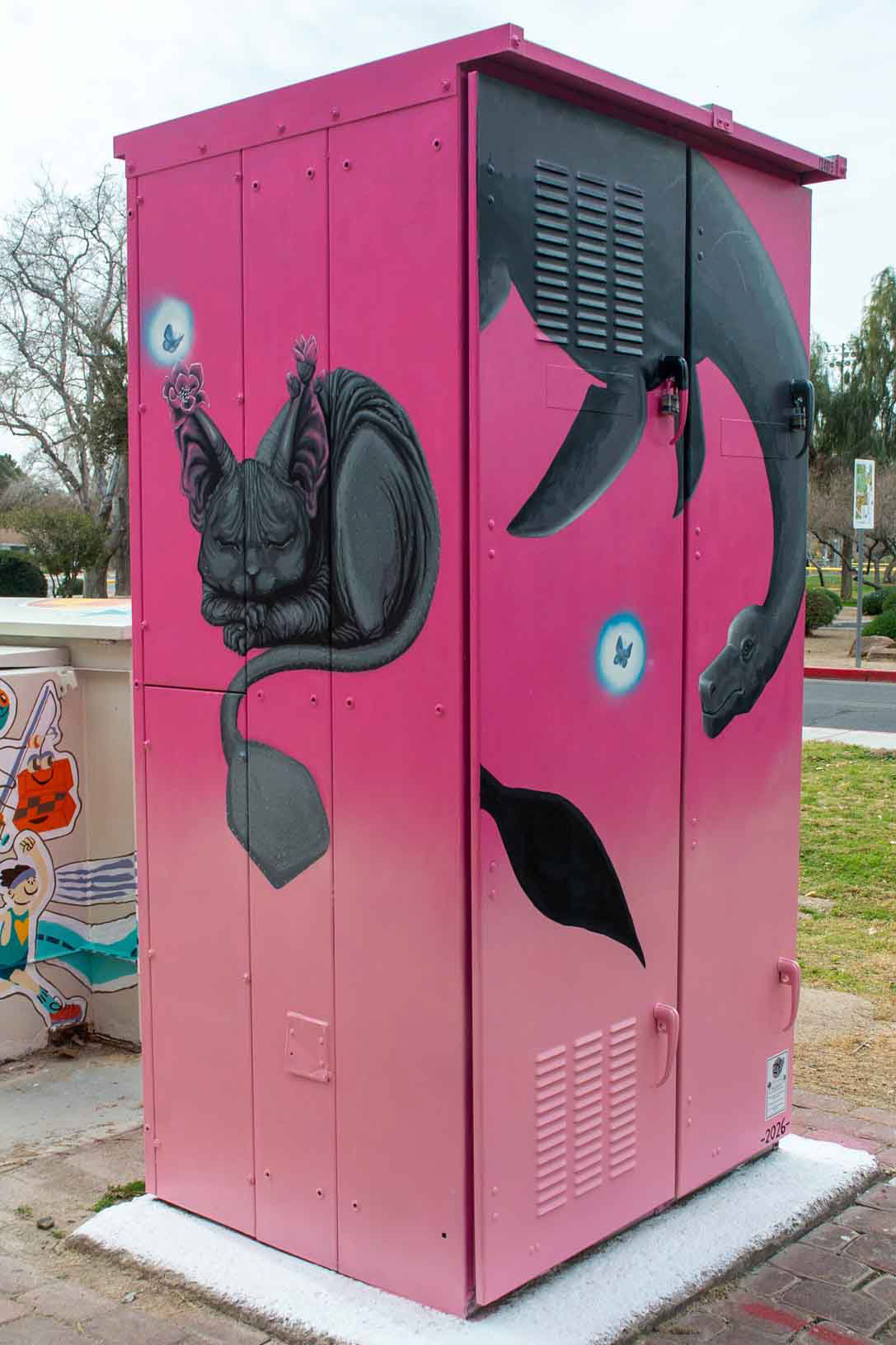 The solid pink gradient background reflects the essence of Sunset Park. Each side of the utility box also features a glowing Mount Charleston Blue Butterfly, a critically endangered species native to the heart of the local mountain. The butterfly is depicted in motion, interacting with each creature as a symbol of balance, coexistence, and environmental awareness. Its presence highlights the importance of conservation while visually connecting myth, ecology, and place.